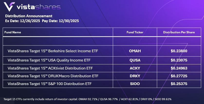 VistaShares, an innovative asset manager seeking to disrupt the status quo in thematic exposures, income investing, and more, is today announcing the distribution amounts for all 8 of its ETFs: VistaShares Target 15 S&P 100 Distribution ETF, VistaShares Target 15 DRUKMacro Distribution ETF (DRKY), VistaShares Target 15 ACKtivist Distribution ETF (ACKY), VistaShares Target 15™ Berkshire Select Income ETF (OMAH), and VistaShares Target 15 USA Quality Income ETF (QUSA).