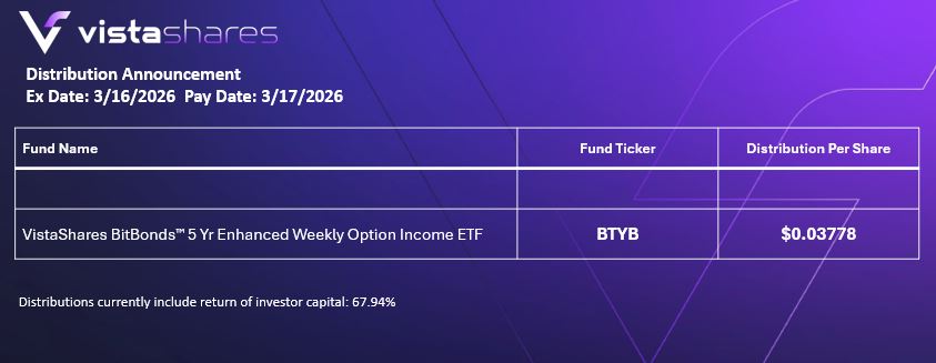 VistaShares Making Weekly Distribution For BitBonds™ 5 Yr Enhanced Weekly Option Income ETF (BTYB)